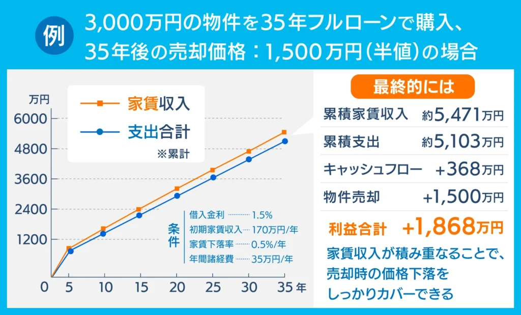 売却価格(キャピタルゲイン)が35年後に50%下がったとしても、35年間にわたり受け取ってきた家賃収入(インカムゲイン)の合計が、ローン返済額や経費の総額を上回るためです。